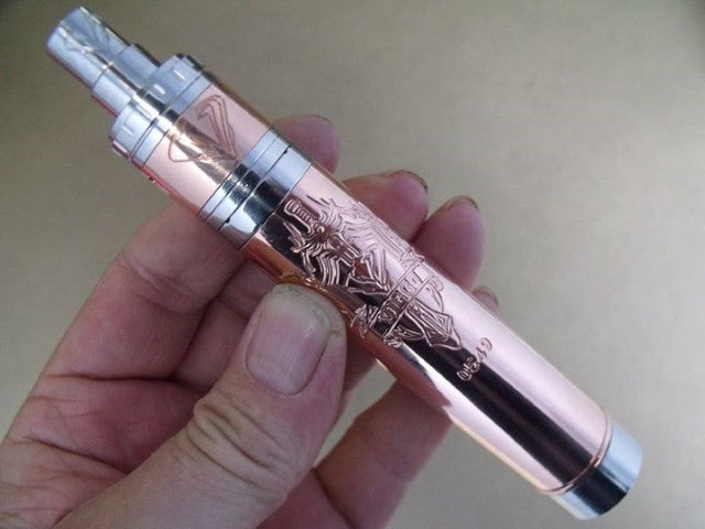 This is the All New Singing and Dancing Viggo Set in Fabulous Polished Copper with polished Stainless Steel Accents and a superb engraved Brass firing button, the cosmetics alone make this probably one of the most beautiful Mod and atomiser currently out there, after spending a few day's with my own one, with my first set up I am blowing Clouds all over the place, the beautiful engraved Viggo wide bore Drip tip certainly helped there, I couldn't be a happier bunny at the moment that's for sure. These are available from this week in store, but be warned we have only 8 set's left.